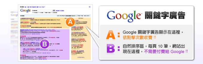 所謂「關鍵字廣告」就是當網友在搜尋引擎上找您的商品或服務, 輸入關鍵字按下"搜尋"後,您的廣告就會出現在排序前面,當這些有需求的網友看到您的廣告後,點擊進入與成交的機會就會大幅增加。 而且廣告曝光是免費的,只有廣告被點擊時才會計價。